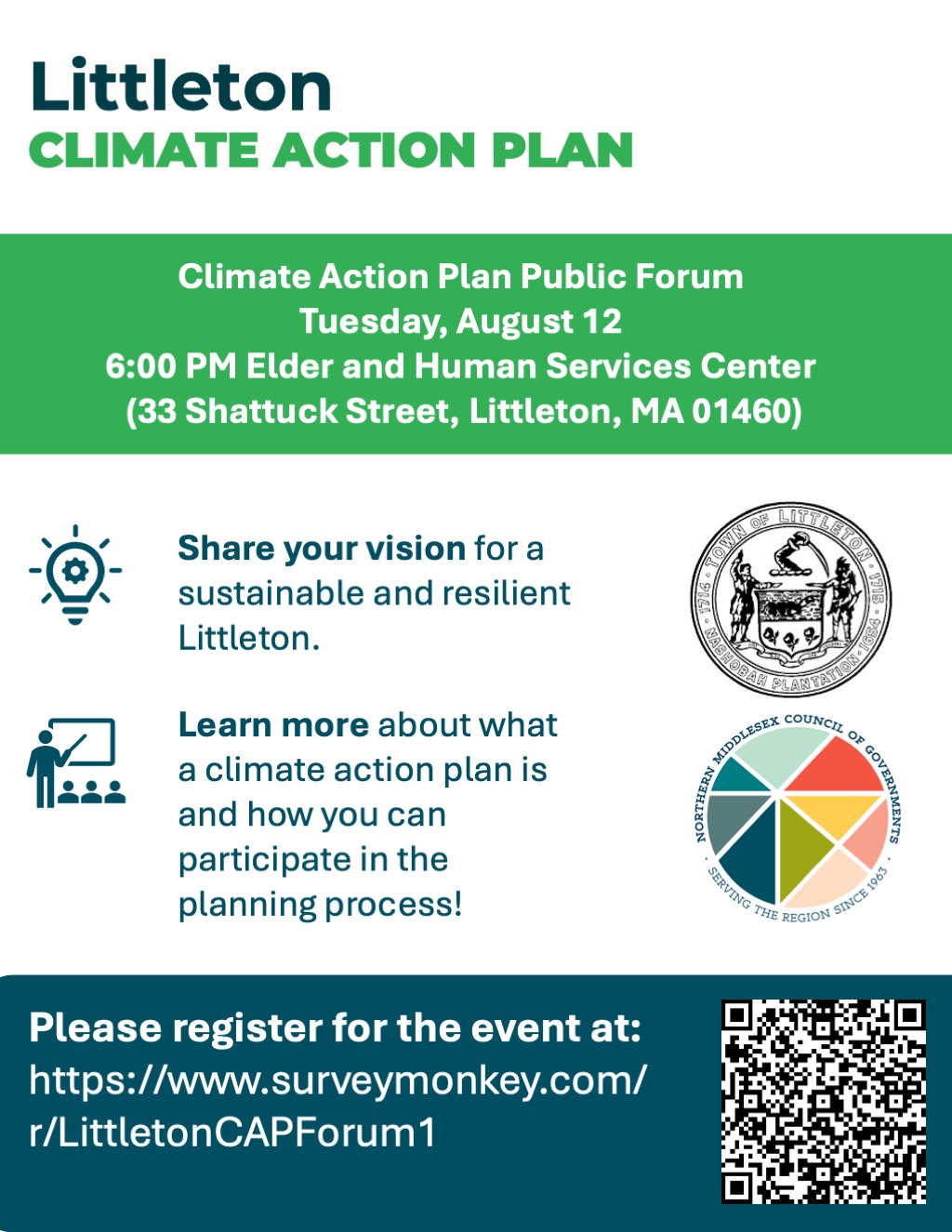 Join the Littleton Sustainability Committee and Northern Middlesex Council of Governments (NMCOG) for a public workshop related to Littleton’s Climate Action Plan (CAP). The CAP represents a significant step toward creating a more sustainable and resilient Littleton and will serve as a guide for the Town to achieve these goals. Your input is crucial! This event will provide residents with the opportunity to learn more about the climate action plan and share their ideas on actions the Town can take to address climate change.